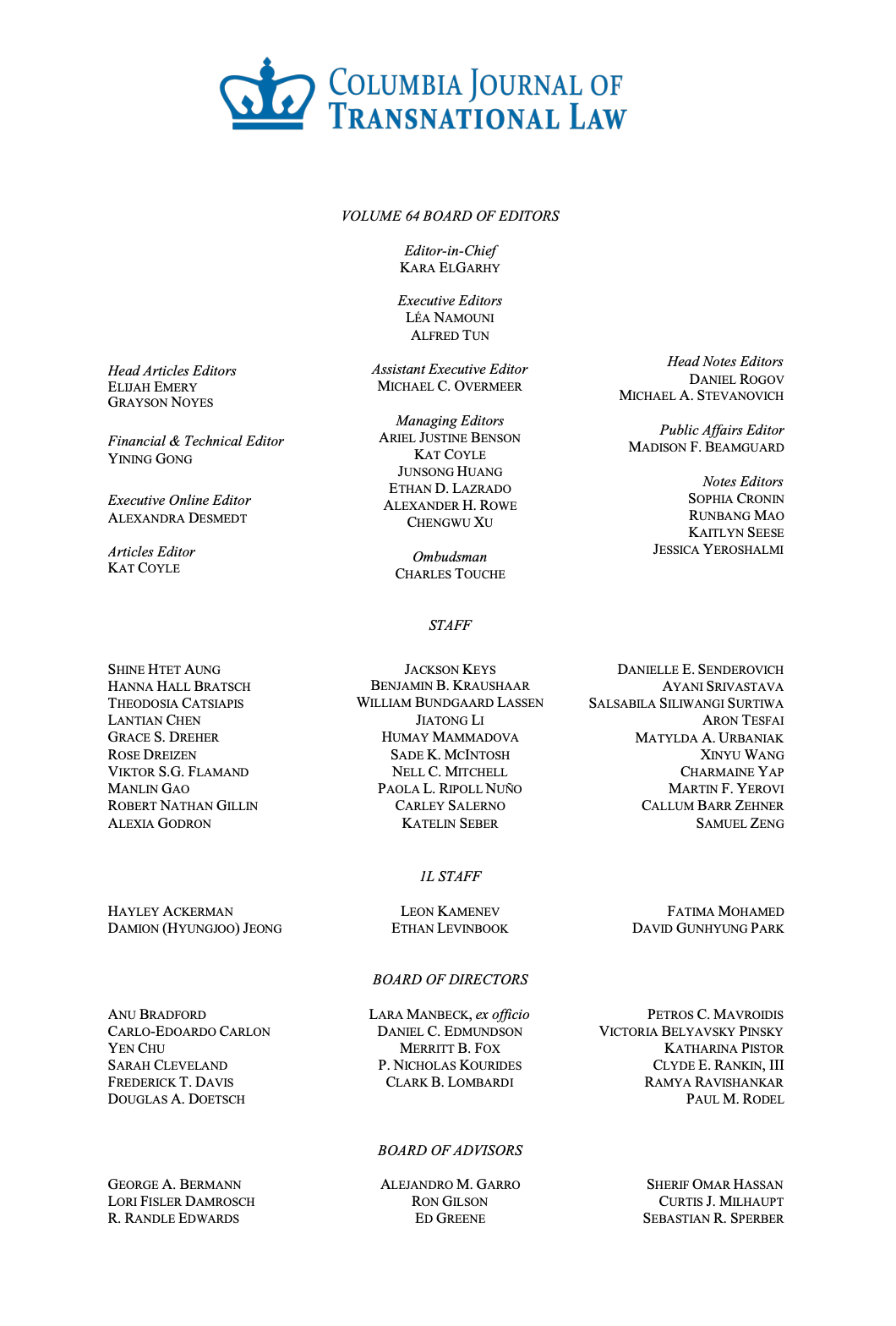 Volume 64 Masthead